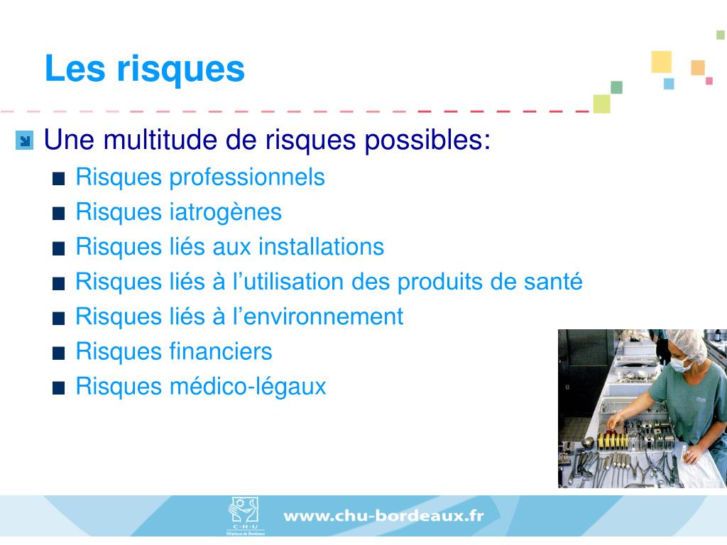 Les risques • Une multitude de risques possibles: • Risques professionnels • Risques iatrogènes • Risques liés aux installations • Risques liés à l’utilisation des produits de santé • Risques liés à l’environnement • Risques financiers • Risques médico-légaux