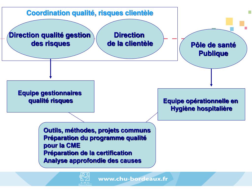 Coordination qualité, risques clientèle Direction qualité gestion des risques Direction de la clientèle Pôle de santé Publique Equipe gestionnaires qualité risques Equipe opérationnelle en Hygiène hospitalière Outils, méthodes, projets communs Préparation du programme qualité pour la CME Préparation de la certification Analyse approfondie des causes
