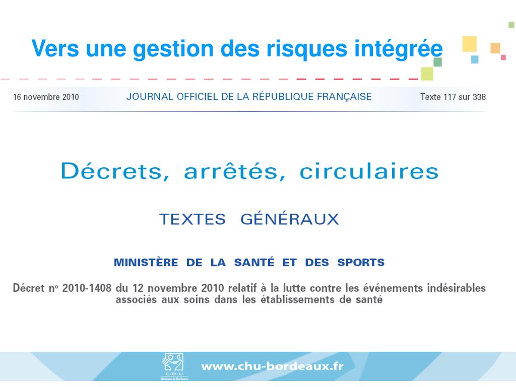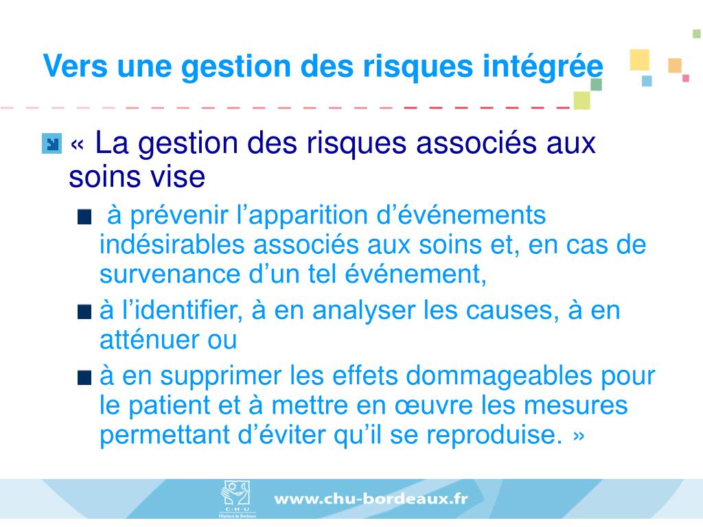 Vers une gestion des risques intégrée • « La gestion des risques associés aux soins vise • à prévenir l’apparition d’événements indésirables associés aux soins et, en cas de survenance d’un tel événement, • à l’identifier, à en analyser les causes, à en atténuer ou • à en supprimer les effets dommageables pour le patient et à mettre en œuvre les mesures permettant d’éviter qu’il se reproduise. »