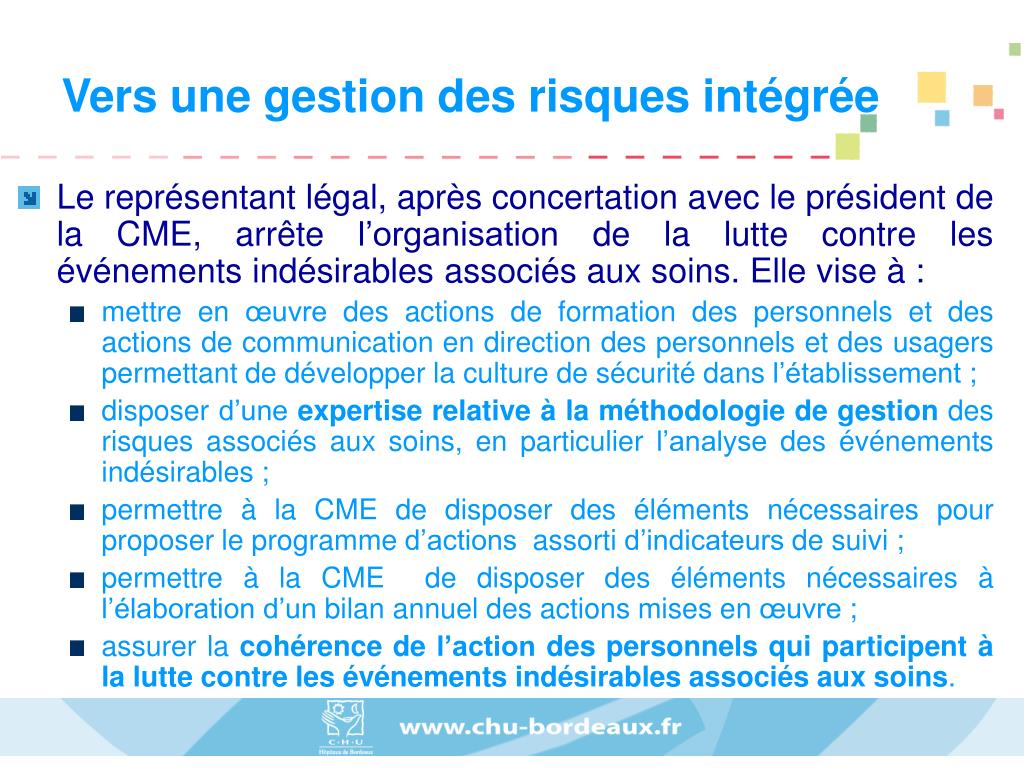 Vers une gestion des risques intégrée • Le représentant légal, après concertation avec le président de la CME, arrête l’organisation de la lutte contre les événements indésirables associés aux soins. Elle vise à : • mettre en œuvre des actions de formation des personnels et des actions de communication en direction des personnels et des usagers permettant de développer la culture de sécurité dans l’établissement ; • disposer d’une expertise relative à la méthodologie de gestion des risques associés aux soins, en particulier l’analyse des événements indésirables ; • permettre à la CME de disposer des éléments nécessaires pour proposer le programme d’actions assorti d’indicateurs de suivi ; • permettre à la CME de disposer des éléments nécessaires à l’élaboration d’un bilan annuel des actions mises en œuvre ; • assurer la cohérence de l’action des personnels qui participent à la lutte contre les événements indésirables associés aux soins.