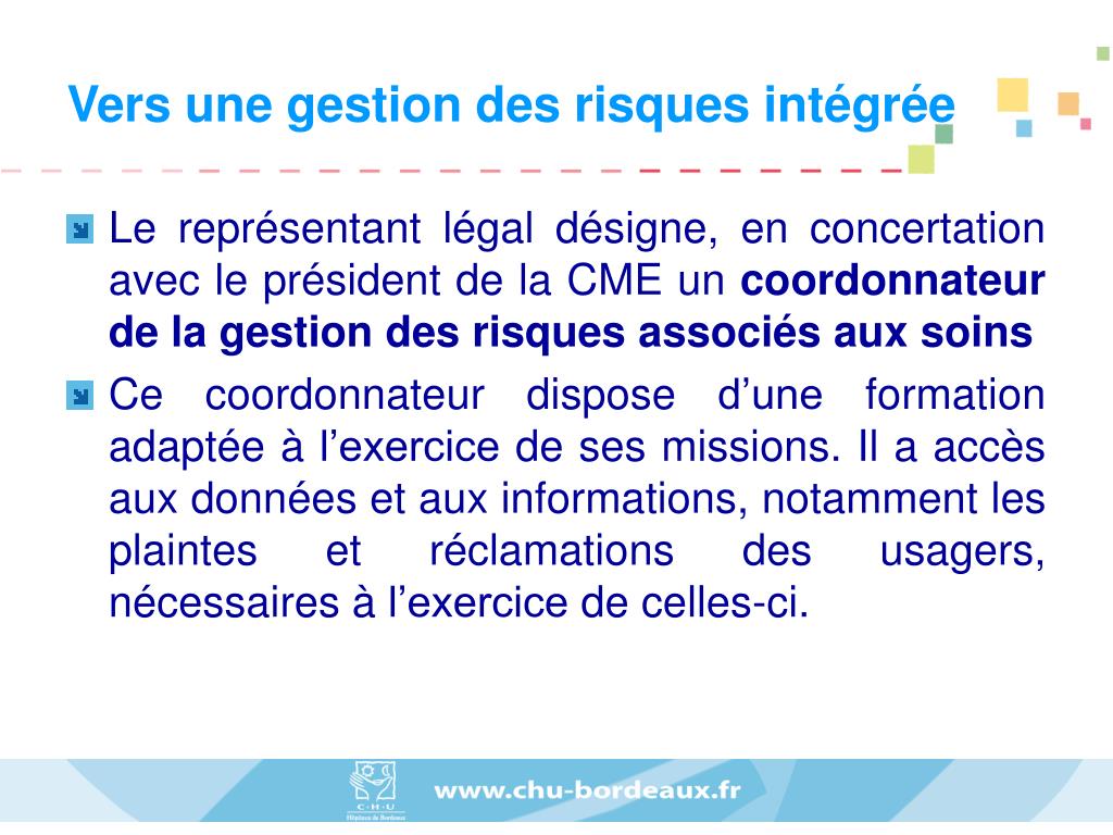 Vers une gestion des risques intégrée • Le représentant légal désigne, en concertation avec le président de la CME un coordonnateur de la gestion des risques associés aux soins • Ce coordonnateur dispose d’une formation adaptée à l’exercice de ses missions. Il a accès aux données et aux informations, notamment les plaintes et réclamations des usagers, nécessaires à l’exercice de celles-ci.