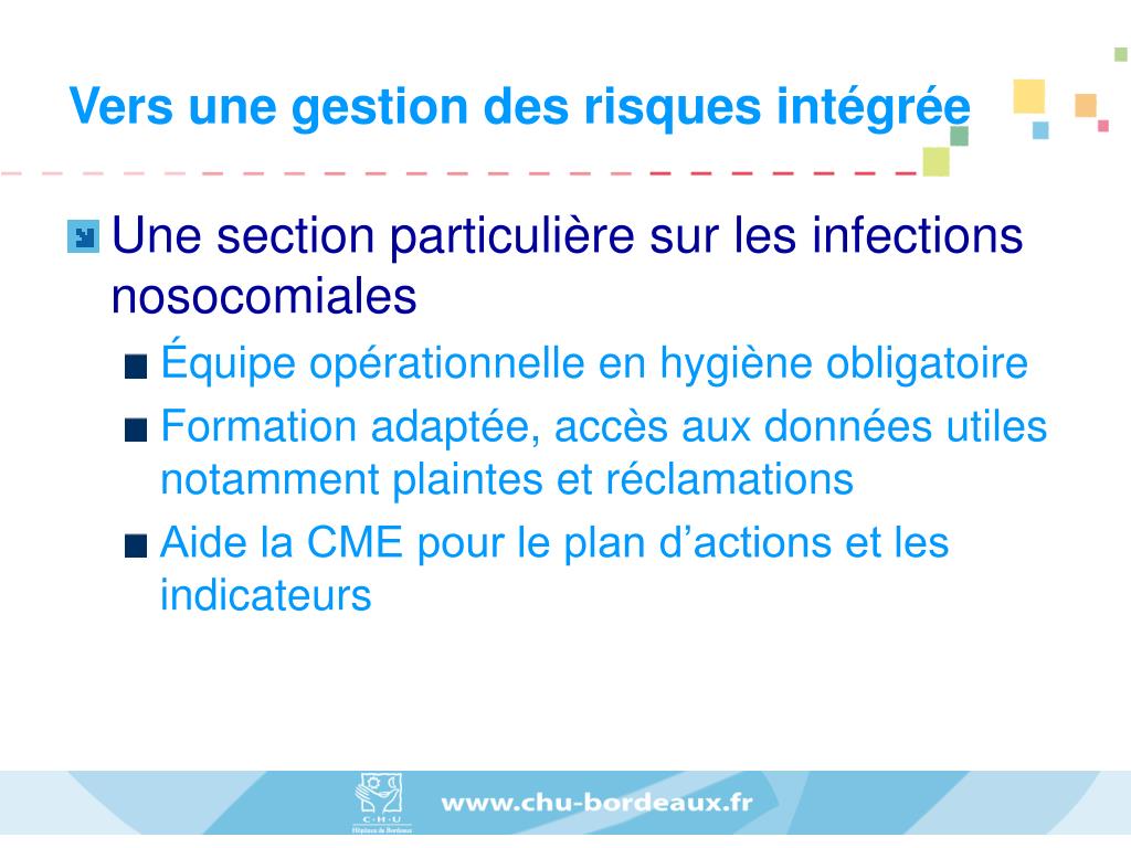 Vers une gestion des risques intégrée • Une section particulière sur les infections nosocomiales • Équipe opérationnelle en hygiène obligatoire • Formation adaptée, accès aux données utiles notamment plaintes et réclamations • Aide la CME pour le plan d’actions et les indicateurs