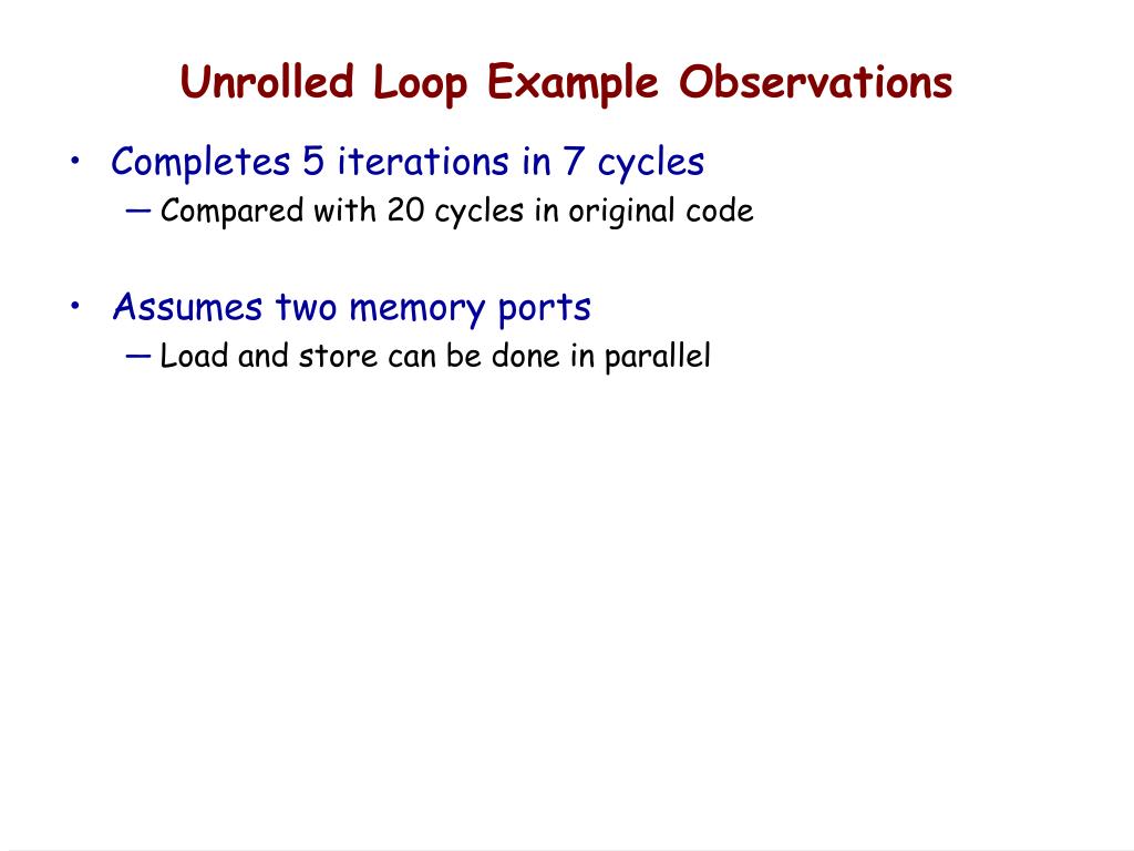 Unrolled Loop Example Observations • Completes 5 iterations in 7 cycles • Compared with 20 cycles in original code • Assumes two memory ports • Load and store can be done in parallel