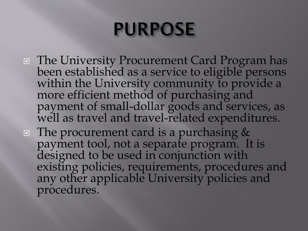 PURPOSE • The University Procurement Card Program has been established as a service to eligible persons within the University community to provide a more efficient method of purchasing and payment of small-dollar goods and services, as well as travel and travel-related expenditures. • The procurement card is a purchasing & payment tool, not a separate program. It is designed to be used in conjunction with existing policies, requirements, procedures and any other applicable University policies and procedures.