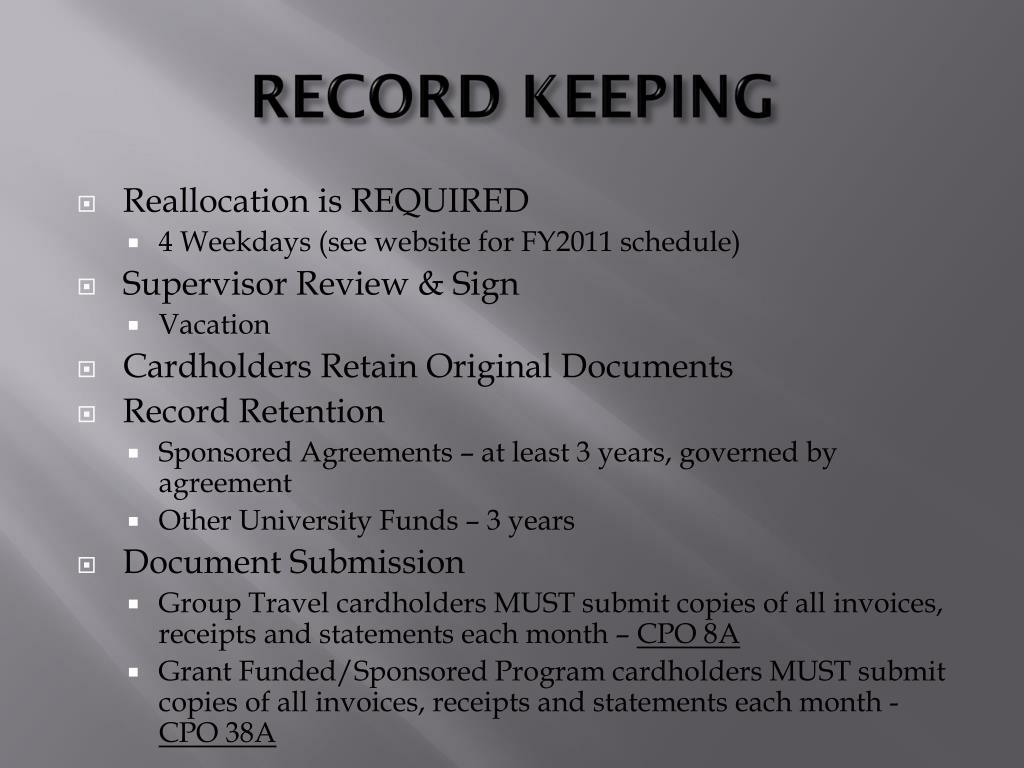 RECORD KEEPING • Reallocation is REQUIRED • 4 Weekdays (see website for FY2011 schedule) • Supervisor Review & Sign • Vacation • Cardholders Retain Original Documents • Record Retention • Sponsored Agreements – at least 3 years, governed by agreement • Other University Funds – 3 years • Document Submission • Group Travel cardholders MUST submit copies of all invoices, receipts and statements each month – CPO 8A • Grant Funded/Sponsored Program cardholders MUST submit copies of all invoices, receipts and statements each month - CPO 38A