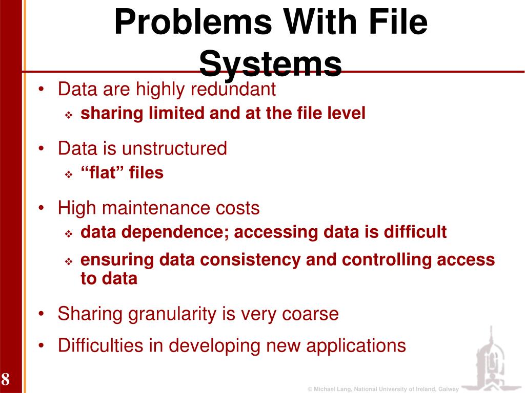 Problems With File Systems • Data are highly redundant • sharing limited and at the file level • Data is unstructured • “flat” files • High maintenance costs • data dependence; accessing data is difficult • ensuring data consistency and controlling access to data • Sharing granularity is very coarse • Difficulties in developing new applications