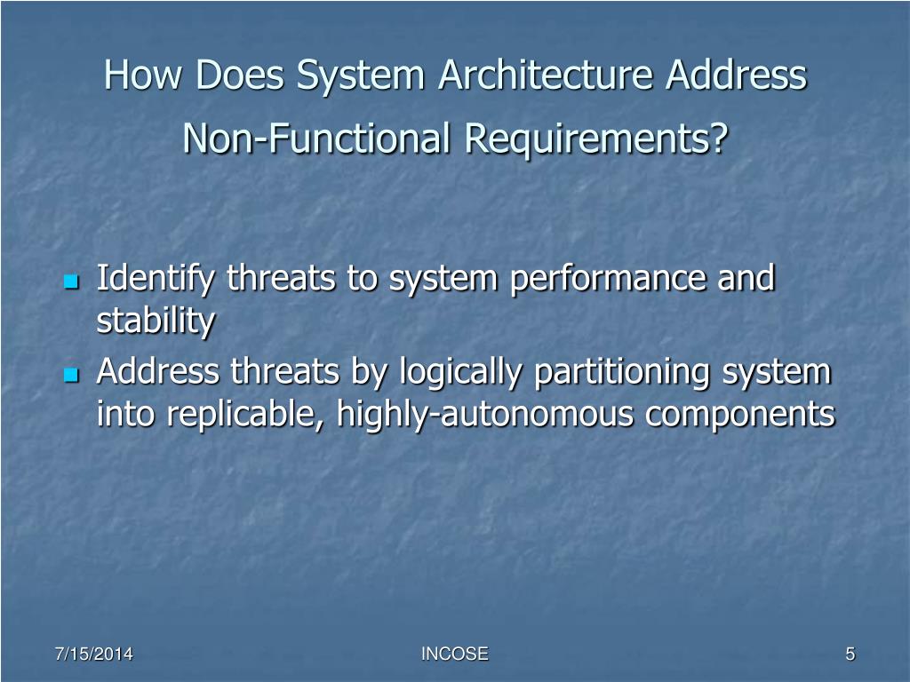 How Does System Architecture Address Non-Functional Requirements? • Identify threats to system performance and stability • Address threats by logically partitioning system into replicable, highly-autonomous components INCOSE
