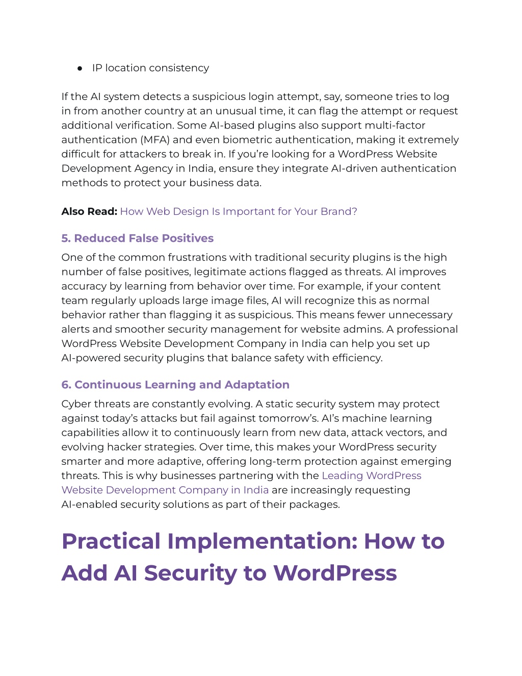 ● IP location consistency If the AI system detects a suspicious login attempt, say, someone tries to log in from another country at an unusual time, it can flag the attempt or request additional verification. Some AI-based plugins also support multi-factor authentication (MFA) and even biometric authentication, making it extremely difficult for attackers to break in. If you’re looking for a WordPress Website Development Agency in India, ensure they integrate AI-driven authentication methods to protect your business data. Also Read:How Web Design Is Important for Your Brand? 5. Reduced False Positives One of the common frustrations with traditional security plugins is the high number of false positives, legitimate actions flagged as threats. AI improves accuracy by learning from behavior over time. For example, if your content team regularly uploads large image files, AI will recognize this as normal behavior rather than flagging it as suspicious. This means fewer unnecessary alerts and smoother security management for website admins. A professional WordPress Website Development Company in India can help you set up AI-powered security plugins that balance safety with efficiency. 6. Continuous Learning and Adaptation Cyber threats are constantly evolving. A static security system may protect against today’s attacks but fail against tomorrow’s. AI’s machine learning capabilities allow it to continuously learn from new data, attack vectors, and evolving hacker strategies. Over time, this makes your WordPress security smarter and more adaptive, offering long-term protection against emerging threats. This is why businesses partnering with the Leading WordPress Website Development Company in India are increasingly requesting AI-enabled security solutions as part of their packages. Practical Implementation: How to Add AI Security to WordPress
