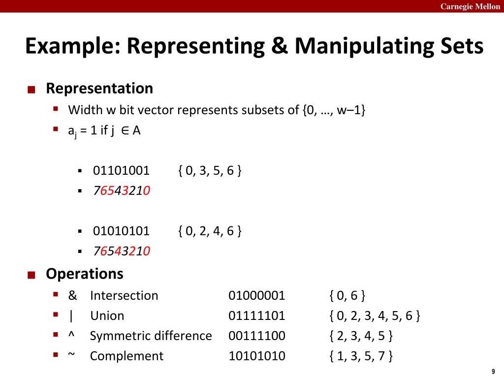 Example: Representing & Manipulating Sets • Representation • Width w bit vector represents subsets of {0, …, w–1} • aj = 1 if j ∈ A • 01101001 { 0, 3, 5, 6 } • 76543210 • 01010101 { 0, 2, 4, 6 } • 76543210 • Operations • & Intersection 01000001 { 0, 6 } • | Union 01111101 { 0, 2, 3, 4, 5, 6 } • ^ Symmetric difference 00111100 { 2, 3, 4, 5 } • ~ Complement 10101010 { 1, 3, 5, 7 }