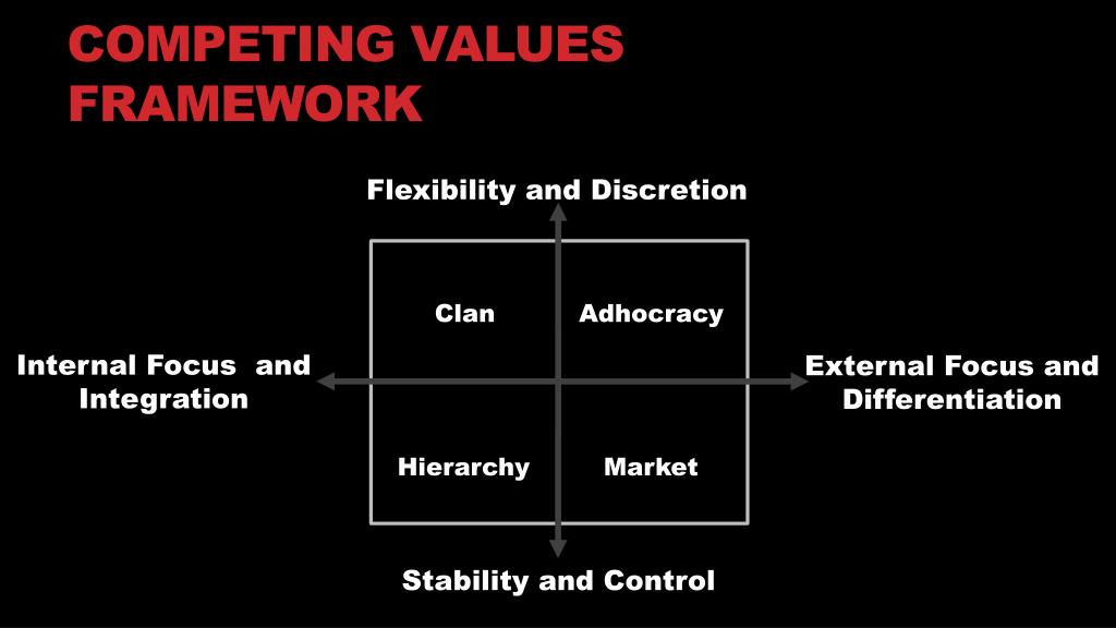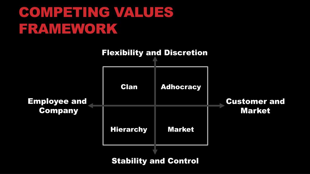 Competing Values Framework Flexibility and Discretion Employee and Company Customer and Market Clan Adhocracy Hierarchy Market Stability and Control