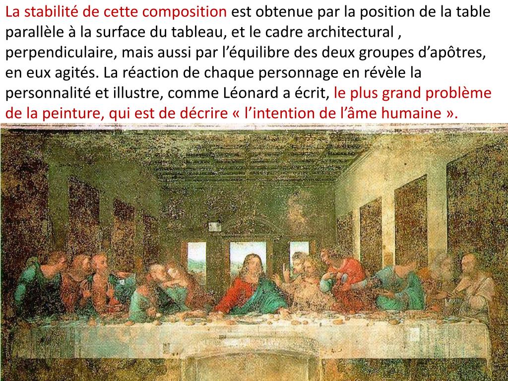 La stabilité de cette composition est obtenue par la position de la table parallèle à la surface du tableau, et le cadre architectural , perpendiculaire, mais aussi par l’équilibre des deux groupes d’apôtres, en eux agités. La réaction de chaque personnage en révèle la personnalité et illustre, comme Léonard a écrit, le plus grand problème de la peinture, qui est de décrire « l’intention de l’âme humaine ».