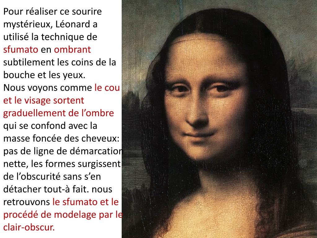 Pour réaliser ce sourire mystérieux, Léonard a utilisé la technique de sfumato en ombrant subtilement les coins de la bouche et les yeux. Nous voyons comme le cou et le visage sortent graduellement de l’ombre qui se confond avec la masse foncée des cheveux: pas de ligne de démarcation nette, les formes surgissent de l’obscurité sans s’en détacher tout-à fait. nous retrouvons le sfumato et le procédé de modelage par le clair-obscur.