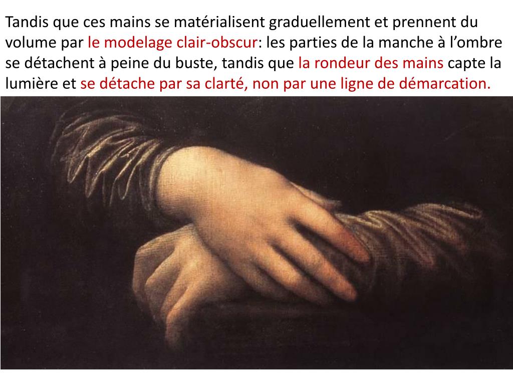 Tandis que ces mains se matérialisent graduellement et prennent du volume par le modelage clair-obscur: les parties de la manche à l’ombre se détachent à peine du buste, tandis que la rondeur des mains capte la lumière et se détache par sa clarté, non par une ligne de démarcation.