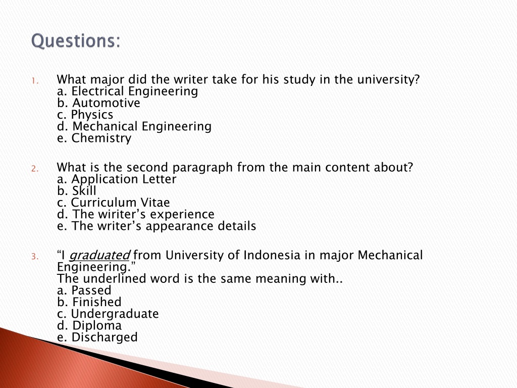 Questions: • What major did the writer take for his study in the university?a. Electrical Engineeringb. Automotivec. Physicsd. Mechanical Engineeringe. Chemistry • What is the second paragraph from the main content about?a. Application Letterb. Skillc. Curriculum Vitaed. The wiriter’s experiencee. The writer’s appearance details • “I graduated from University of Indonesia inmajor Mechanical Engineering.”The underlined word is the same meaning with..a. Passedb. Finishedc. Undergraduated. Diplomae. Discharged