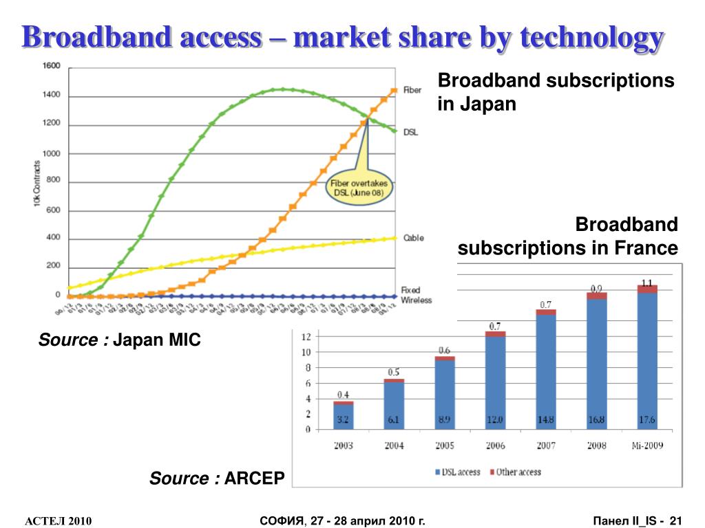 Broadband access – market share by technology Broadband subscriptions inJapan Broadband subscriptions in France Source : Japan MIC Source : ARCEP