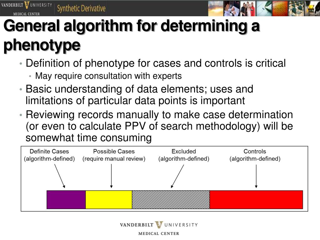 General algorithm for determining a phenotype • Definition of phenotype for cases and controls is critical • May require consultation with experts • Basic understanding of data elements; uses and limitations of particular data points is important • Reviewing records manually to make case determination (or even to calculate PPV of search methodology) will be somewhat time consuming