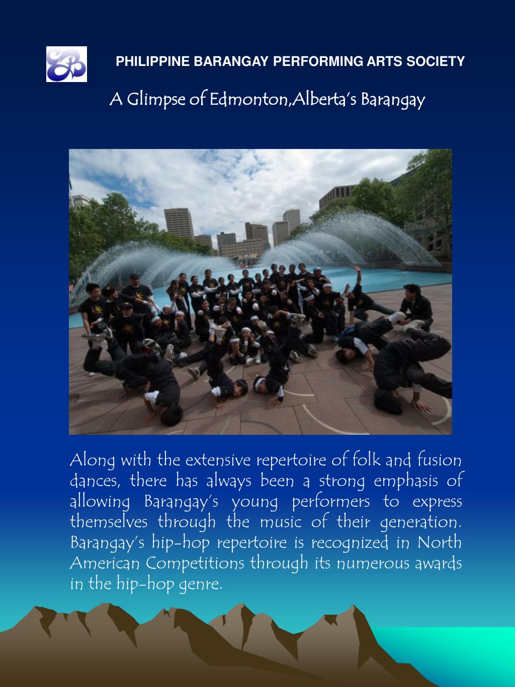 PHILIPPINE BARANGAY PERFORMING ARTS SOCIETY A Glimpse of Edmonton,Alberta’s Barangay Along with the extensive repertoire of folk and fusion dances, there has always been a strong emphasis of allowing Barangay’s young performers to express themselves through the music of their generation. Barangay’s hip-hop repertoire is recognized in North American Competitions through its numerous awards in the hip-hop genre.