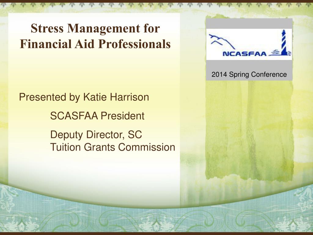 2014 Spring Conference Stress Management for Financial Aid Professionals Presented by Katie Harrison SCASFAA President Deputy Director, SC Tuition Grants Commission
