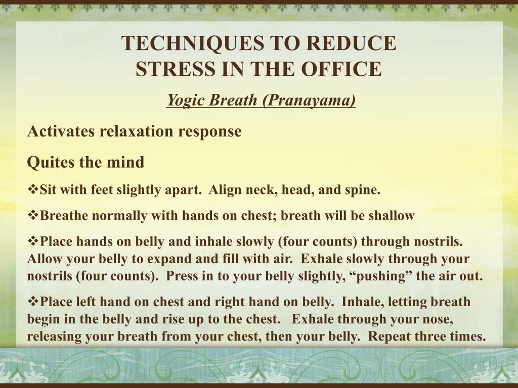 TECHNIQUES TO REDUCE STRESS IN THE OFFICE • Yogic Breath (Pranayama) • Activates relaxation response • Quites the mind • Sit with feet slightly apart. Align neck, head, and spine. • Breathe normally with hands on chest; breath will be shallow • Place hands on belly and inhale slowly (four counts) through nostrils. Allow your belly to expand and fill with air. Exhale slowly through your nostrils (four counts). Press in to your belly slightly, “pushing” the air out. • Place left hand on chest and right hand on belly. Inhale, letting breath begin in the belly and rise up to the chest. Exhale through your nose, releasing your breath from your chest, then your belly. Repeat three times.