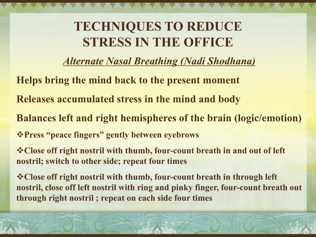 TECHNIQUES TO REDUCE STRESS IN THE OFFICE • Alternate Nasal Breathing (NadiShodhana) • Helps bring the mind back to the present moment • Releases accumulated stress in the mind and body • Balances left and right hemispheres of the brain (logic/emotion) • Press “peace fingers” gently between eyebrows • Close off right nostril with thumb, four-count breath in and out of left nostril; switch to other side; repeat four times • Close off right nostril with thumb, four-count breath in through left nostril, close off left nostril with ring and pinky finger, four-count breath out through right nostril ; repeat on each side four times