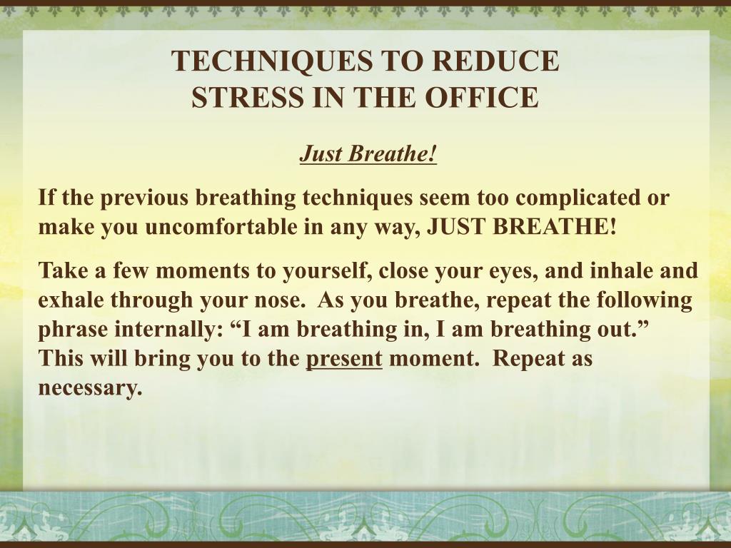 TECHNIQUES TO REDUCE STRESS IN THE OFFICE Just Breathe! If the previous breathing techniques seem too complicated or make you uncomfortable in any way, JUST BREATHE! Take a few moments to yourself, close your eyes, and inhale and exhale through your nose. As you breathe, repeat the following phrase internally: “I am breathing in, I am breathing out.” This will bring you to the present moment. Repeat as necessary.