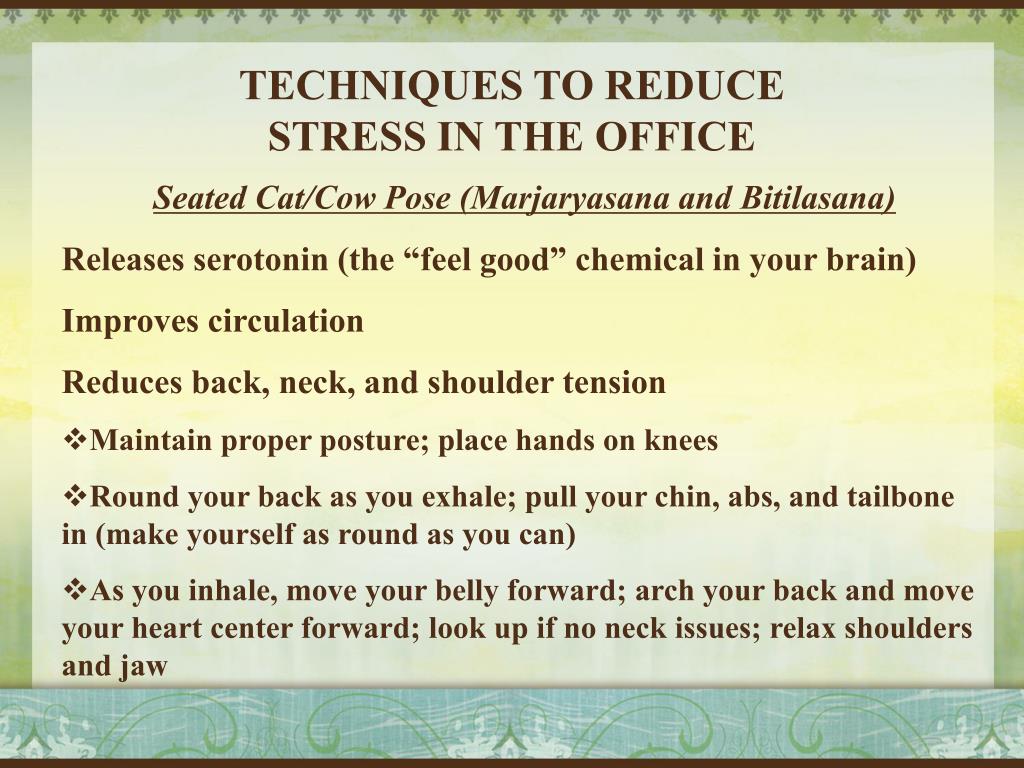 TECHNIQUES TO REDUCE STRESS IN THE OFFICE • Seated Cat/Cow Pose (Marjaryasana and Bitilasana) • Releases serotonin (the “feel good” chemical in your brain) • Improves circulation • Reduces back, neck, and shoulder tension • Maintain proper posture; place hands on knees • Round your back as you exhale; pull your chin, abs, and tailbone in (make yourself as round as you can) • As you inhale, move your belly forward; arch your back and move your heart center forward; look up if no neck issues; relax shoulders and jaw
