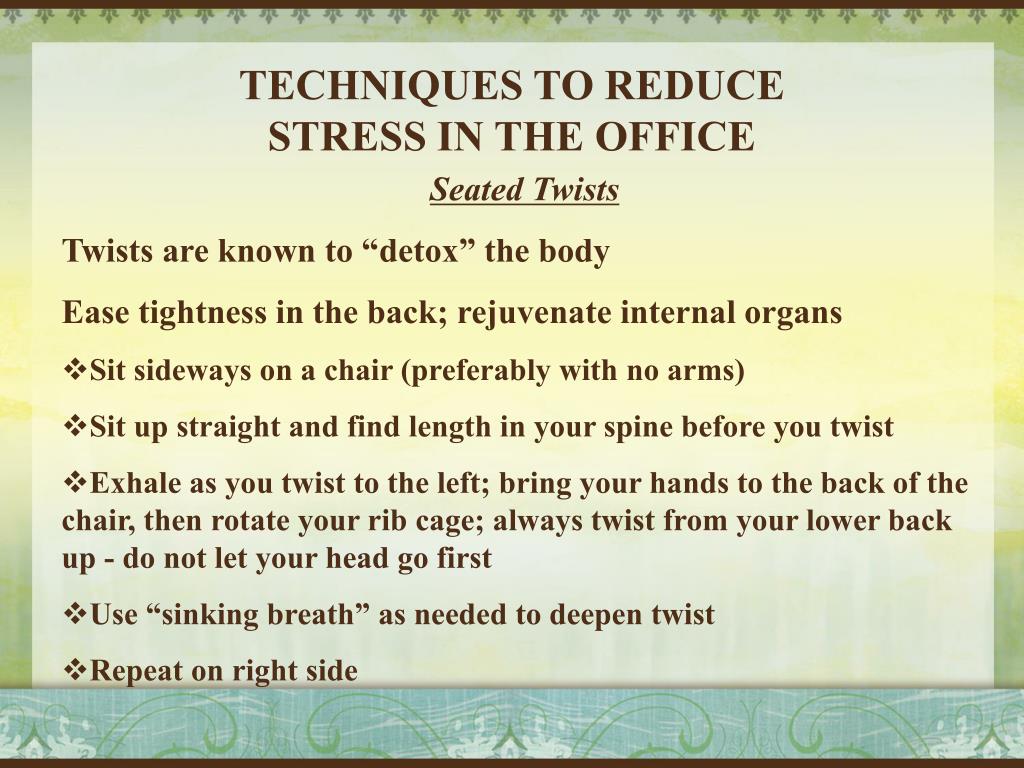 TECHNIQUES TO REDUCE STRESS IN THE OFFICE • Seated Twists • Twists are known to “detox” the body • Ease tightness in the back; rejuvenate internal organs • Sit sideways on a chair (preferably with no arms) • Sit up straight and find length in your spine before you twist • Exhale as you twist to the left; bring your hands to the back of the chair, then rotate your rib cage; always twist from your lower back up - do not let your head go first • Use “sinking breath” as needed to deepen twist • Repeat on right side
