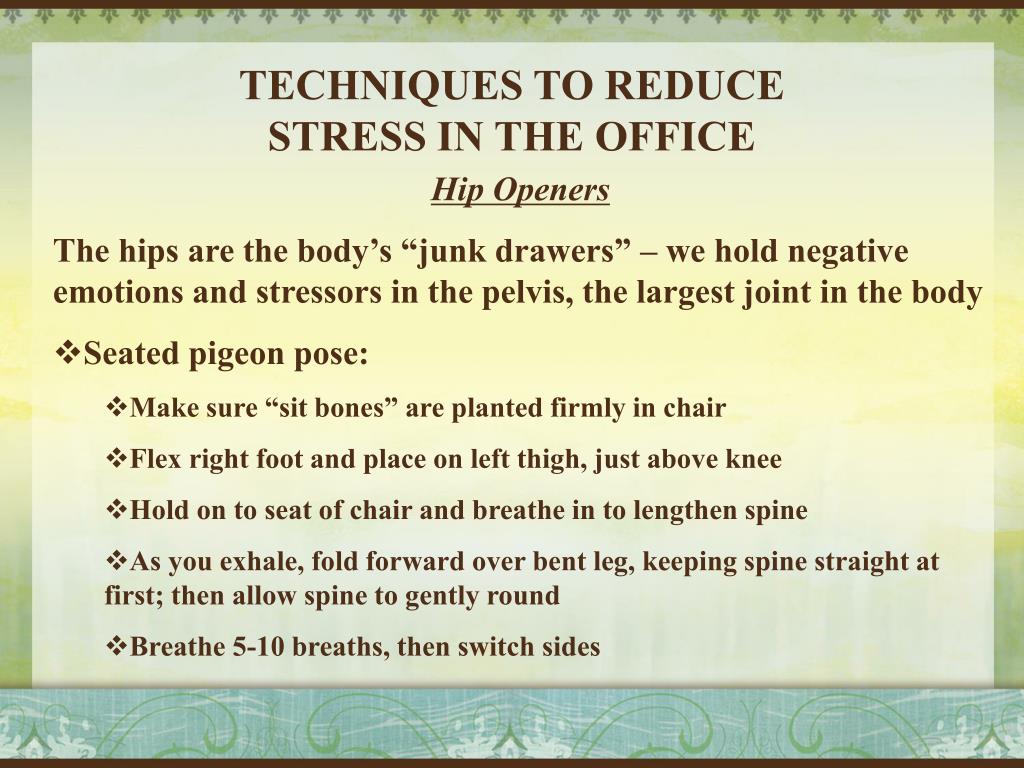 TECHNIQUES TO REDUCE STRESS IN THE OFFICE • Hip Openers • The hips are the body’s “junk drawers” – we hold negative emotions and stressors in the pelvis, the largest joint in the body • Seated pigeon pose: • Make sure “sit bones” are planted firmly in chair • Flex right foot and place on left thigh, just above knee • Hold on to seat of chair and breathe in to lengthen spine • As you exhale, fold forward over bent leg, keeping spine straight at first; then allow spine to gently round • Breathe 5-10 breaths, then switch sides