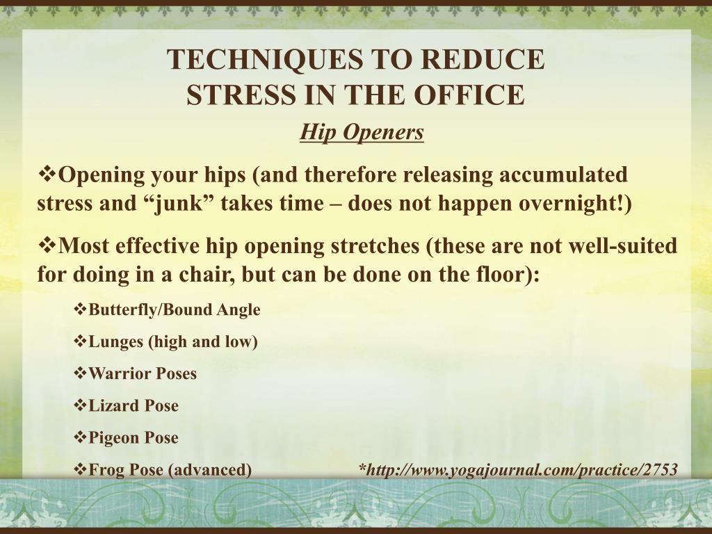 TECHNIQUES TO REDUCE STRESS IN THE OFFICE • Hip Openers • Opening your hips (and therefore releasing accumulated stress and “junk” takes time – does not happen overnight!) • Most effective hip opening stretches (these are not well-suited for doing in a chair, but can be done on the floor): • Butterfly/Bound Angle • Lunges (high and low) • Warrior Poses • Lizard Pose • Pigeon Pose • Frog Pose (advanced) *http://www.yogajournal.com/practice/2753
