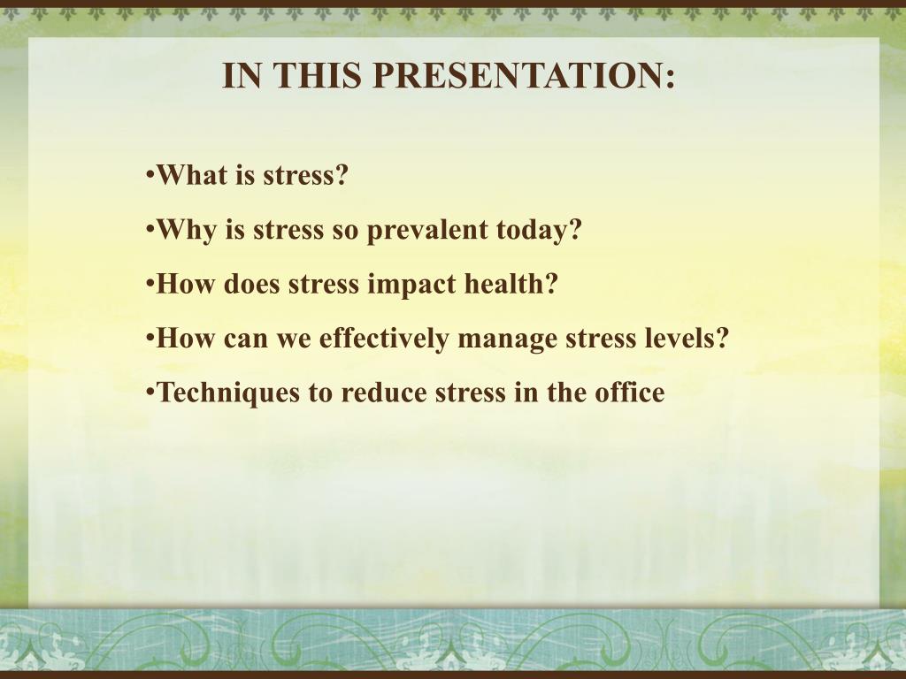 IN THIS PRESENTATION: • What is stress? • Why is stress so prevalent today? • How does stress impact health? • How can we effectively manage stress levels? • Techniques to reduce stress in the office
