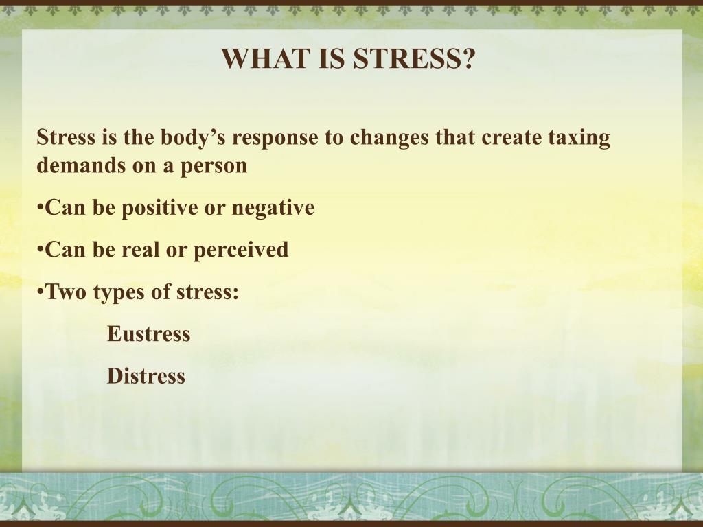 WHAT IS STRESS? • Stress is the body’s response to changes that create taxing demands on a person • Can be positive or negative • Can be real or perceived • Two types of stress: • Eustress • Distress