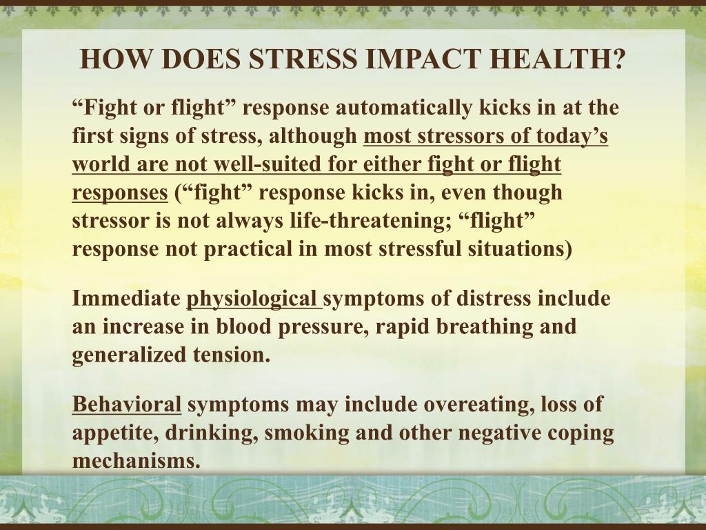 HOW DOES STRESS IMPACT HEALTH? “Fight or flight” response automatically kicks in at the first signs of stress, although most stressors of today’s world are not well-suited for either fight or flight responses (“fight” response kicks in, even though stressor is not always life-threatening; “flight” response not practical in most stressful situations) Immediate physiological symptoms of distress include an increase in blood pressure, rapid breathing and generalized tension. Behavioralsymptoms may include overeating, loss of appetite, drinking, smoking and other negative coping mechanisms.