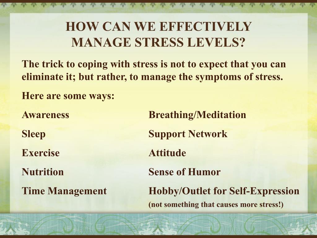 HOW CAN WE EFFECTIVELY MANAGE STRESS LEVELS? The trick to coping with stress is not to expect that you can eliminate it; but rather, to manage the symptoms of stress. Here are some ways: Awareness Breathing/Meditation Sleep Support Network Exercise Attitude Nutrition Sense of Humor Time Management Hobby/Outlet for Self-Expression (not something that causes more stress!)