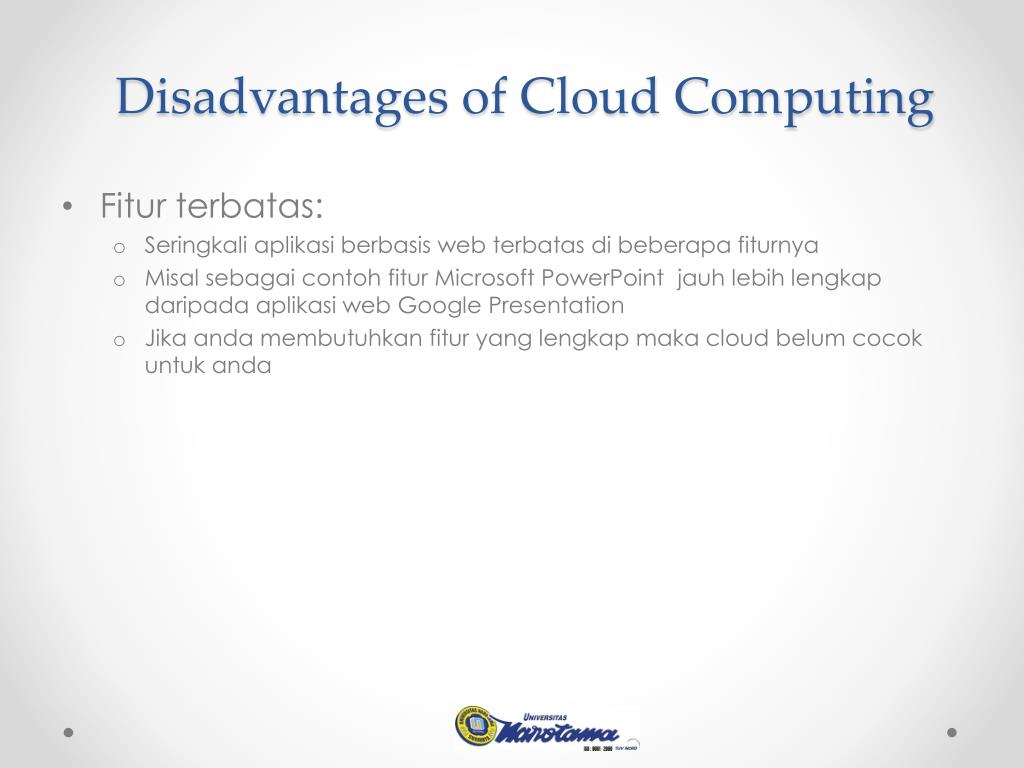 Disadvantages of Cloud Computing • Fiturterbatas: • Seringkaliaplikasiberbasis web terbatas di beberapafiturnya • Misalsebagaicontohfitur Microsoft PowerPoint jauhlebihlengkapdaripadaaplikasi web Google Presentation • Jikaandamembutuhkanfitur yang lengkapmaka cloud belumcocokuntukanda