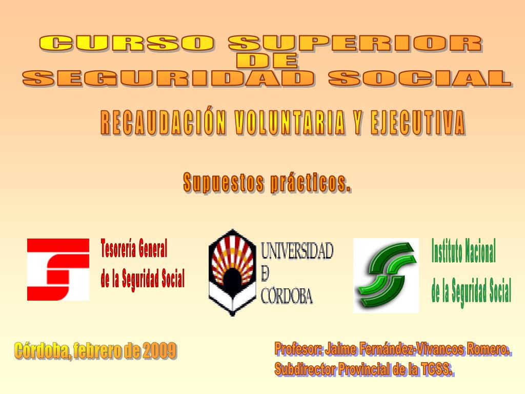 CURSO SUPERIOR DE SEGURIDAD SOCIAL RECAUDACIÓN VOLUNTARIA Y EJECUTIVA Supuestos prácticos. Tesorería General de la Seguridad Social Instituto Nacional de la Seguridad Social Córdoba, febrero de 2009 Profesor: Jaime Fernández-Vivancos Romero. Subdirector Provincial de la TGSS.