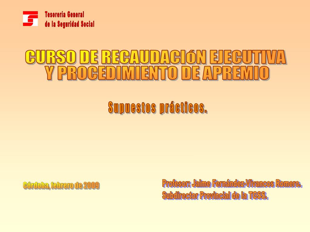 Tesorería General de la Seguridad Social CURSO DE RECAUDACIÓN EJECUTIVA Y PROCEDIMIENTO DE APREMIO Supuestos prácticos. Profesor: Jaime Fernández-Vivancos Romero. Subdirector Provincial de la TGSS. Córdoba, febrero de 2009