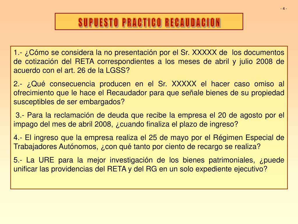 - 4 - SUPUESTO PRACTICO RECAUDACION 1.- ¿Cómo se considera la no presentación por el Sr. XXXXX de los documentos de cotización del RETA correspondientes a los meses de abril y julio 2008 de acuerdo con el art. 26 de la LGSS? 2.- ¿Qué consecuencia producen en el Sr. XXXXX el hacer caso omiso al ofrecimiento que le hace el Recaudador para que señale bienes de su propiedad susceptibles de ser embargados? 3.- Para la reclamación de deuda que recibe la empresa el 20 de agosto por el impago del mes de abril 2008, ¿cuando finaliza el plazo de ingreso? 4.- El ingreso que la empresa realiza el 25 de mayo por el Régimen Especial de Trabajadores Autónomos, ¿con qué tanto por ciento de recargo se realiza? 5.- La URE para la mejor investigación de los bienes patrimoniales, ¿puede unificar las providencias del RETA y del RG en un solo expediente ejecutivo?