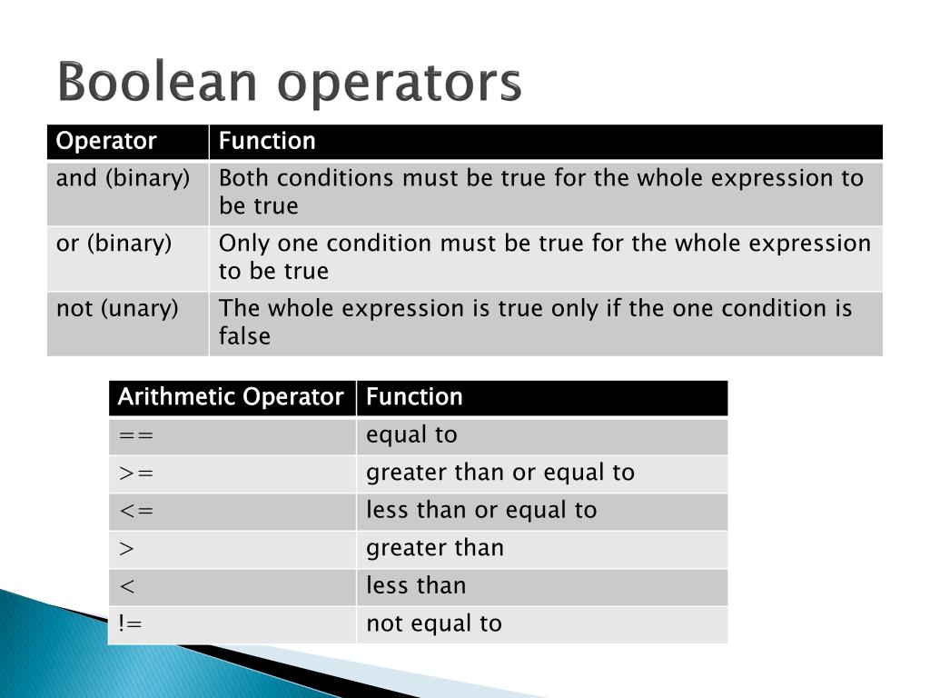 Truth table: not • not is an unary operator, which means it works on just one condition, not on two condition, like the binary operators and & or. The truth table for not is very simple: