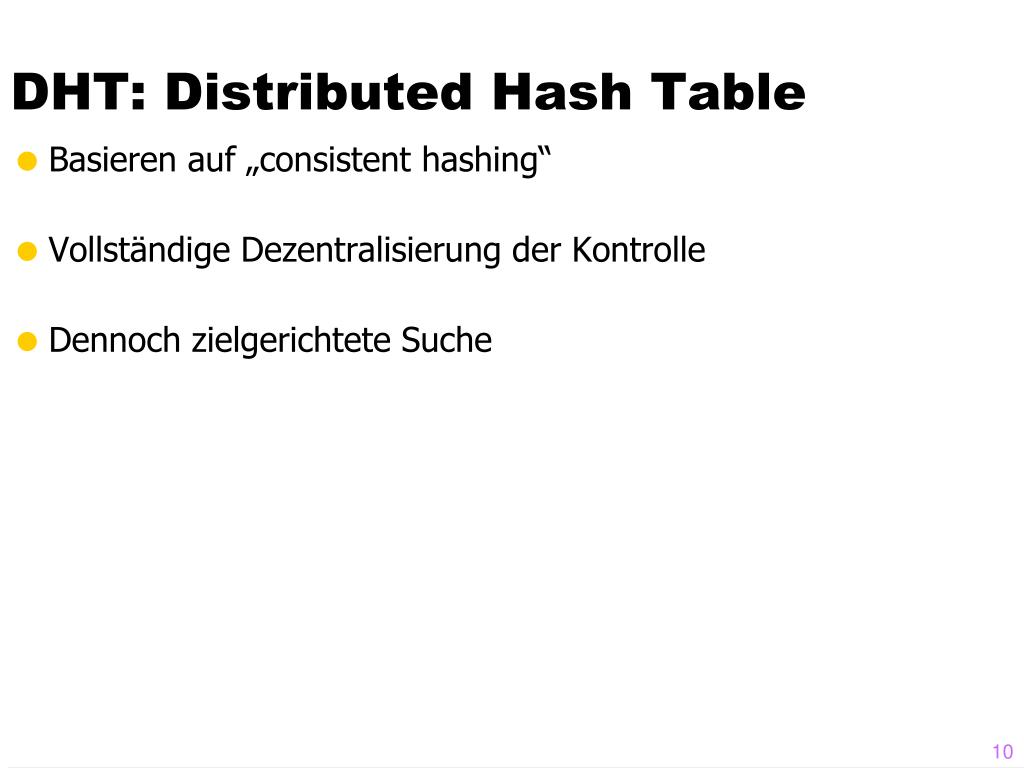 DHT: Distributed Hash Table • Basieren auf „consistent hashing“ • Vollständige Dezentralisierung der Kontrolle • Dennoch zielgerichtete Suche