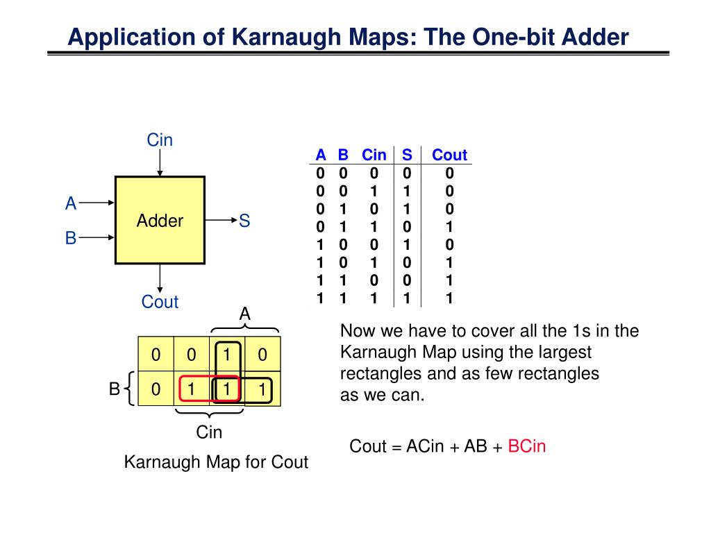 Cin A Adder 1 0 S 1 1 B A B Cin Cout Application of Karnaugh Maps: The One-bit Adder Now we have to cover all the 1s in the Karnaugh Map using the largest rectangles and as few rectangles as we can. 0 0 0 1 Cout = ACin + AB + BCin Karnaugh Map for Cout