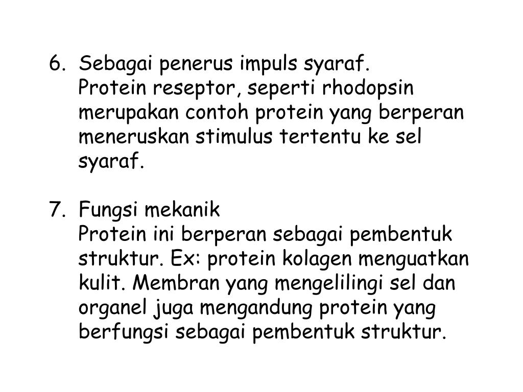 Sebagaipenerusimpulssyaraf. Protein reseptor, sepertirhodopsinmerupakancontoh protein yang berperanmeneruskan stimulus tertentukeselsyaraf. Fungsimekanik Protein iniberperansebagaipembentukstruktur. Ex: protein kolagenmenguatkankulit. Membran yang mengelilingiseldanorganeljugamengandung protein yang berfungsisebagaipembentukstruktur.