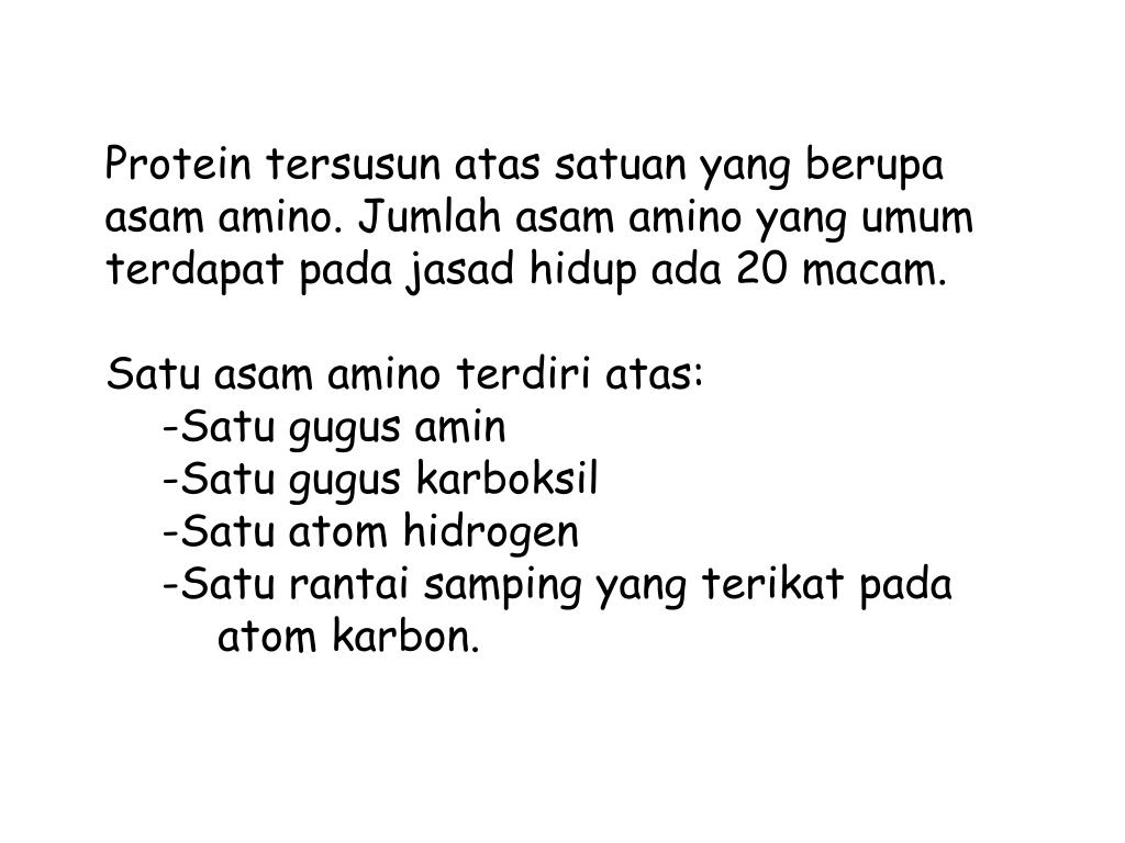 Protein tersusunatassatuan yang berupaasam amino. Jumlahasam amino yang umumterdapatpadajasadhidupada 20 macam. • Satuasam amino terdiriatas: • Satugugusamin • Satuguguskarboksil • Satu atom hidrogen • Saturantaisamping yang terikatpada atom karbon.