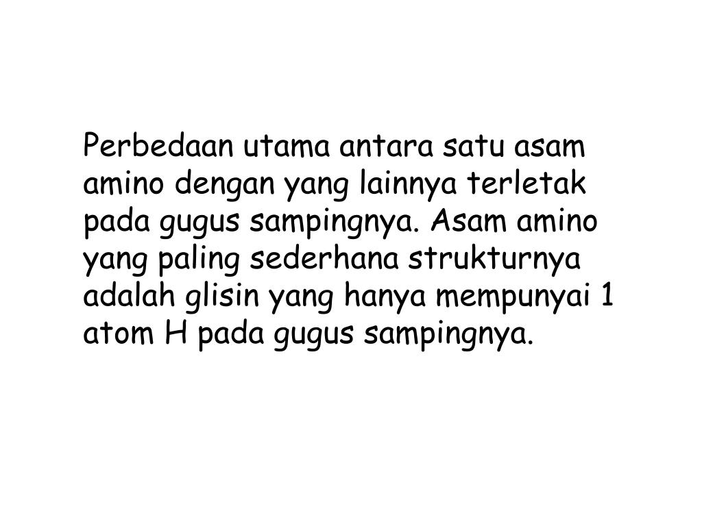 Perbedaanutamaantarasatuasam amino dengan yang lainnyaterletakpadagugussampingnya. Asam amino yang paling sederhanastrukturnyaadalahglisin yang hanyamempunyai 1 atom H padagugussampingnya.