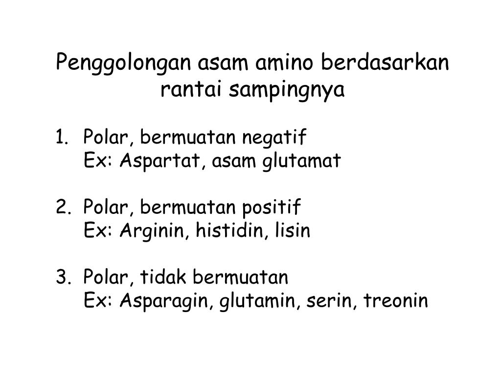 Penggolonganasam amino berdasarkanrantaisampingnya Polar, bermuatannegatif Ex: Aspartat, asamglutamat Polar, bermuatanpositif Ex: Arginin, histidin, lisin Polar, tidakbermuatan Ex: Asparagin, glutamin, serin, treonin