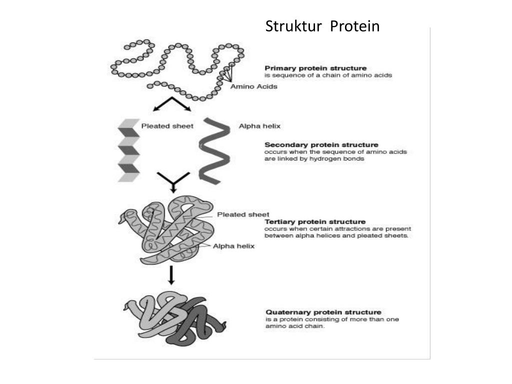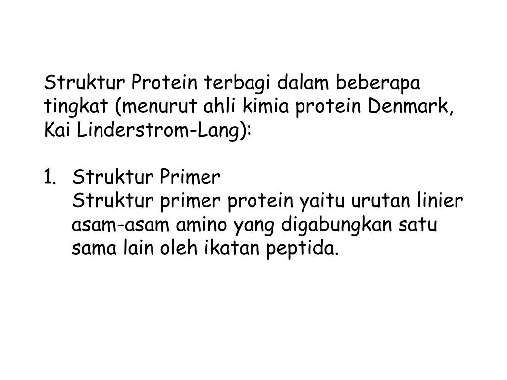 Struktur Protein terbagidalambeberapatingkat (menurutahlikimia protein Denmark, Kai Linderstrom-Lang): Struktur Primer Struktur primer protein yaituurutan linier asam-asam amino yang digabungkansatusama lain olehikatanpeptida.