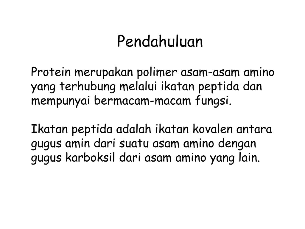 Pendahuluan Protein merupakanpolimerasam-asam amino yang terhubungmelaluiikatanpeptidadanmempunyaibermacam-macamfungsi. Ikatanpeptidaadalahikatankovalenantaragugusamindarisuatuasam amino denganguguskarboksildariasam amino yang lain.