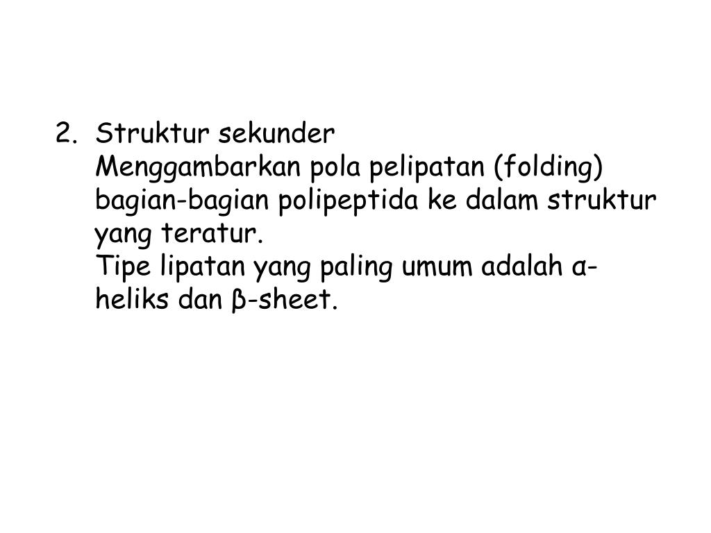 Struktursekunder Menggambarkanpolapelipatan (folding) bagian-bagianpolipeptidakedalamstruktur yang teratur. Tipelipatan yang paling umumadalahα-heliksdanβ-sheet.