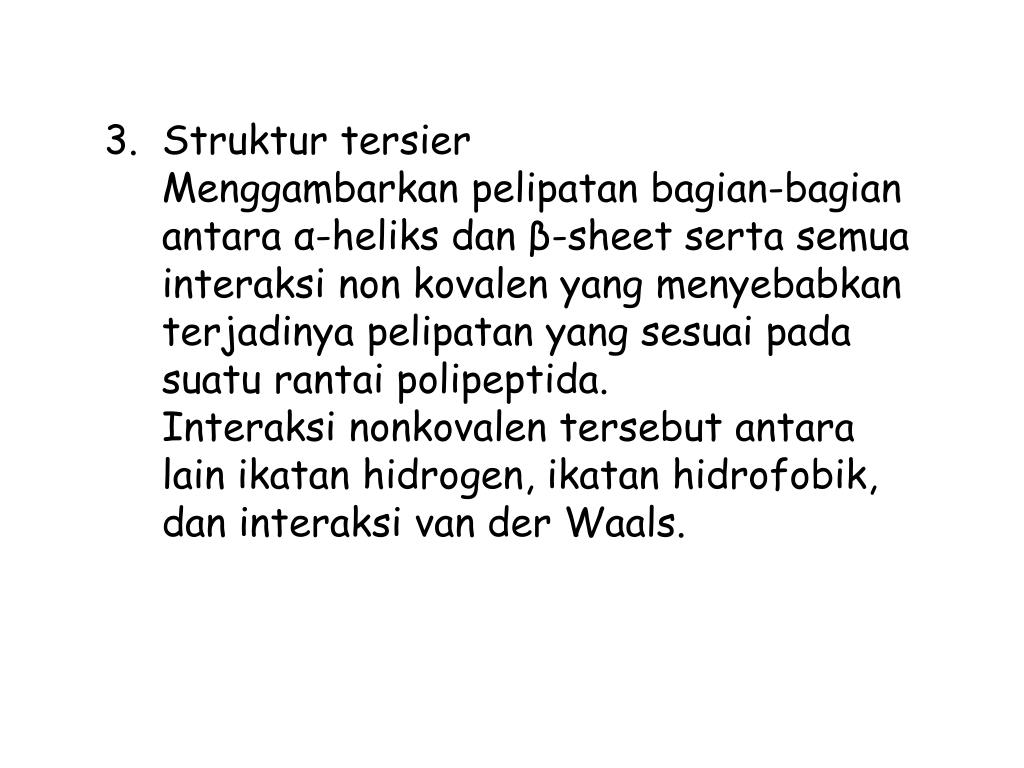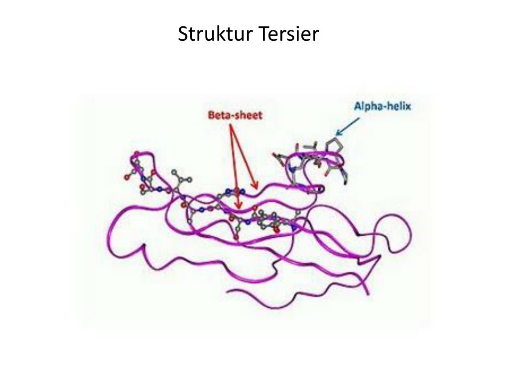 Strukturtersier Menggambarkanpelipatanbagian-bagianantaraα-heliksdanβ-sheet sertasemuainteraksi non kovalen yang menyebabkanterjadinyapelipatan yang sesuaipadasuaturantaipolipeptida. Interaksinonkovalentersebutantara lain ikatanhidrogen, ikatanhidrofobik, daninteraksi van der Waals.