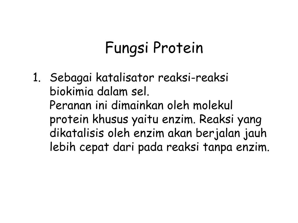 Fungsi Protein Sebagaikatalisatorreaksi-reaksibiokimiadalam sel. Perananinidimainkanolehmolekul protein khususyaituenzim. Reaksi yang dikatalisisolehenzimakanberjalanjauhlebihcepatdaripadareaksitanpaenzim.