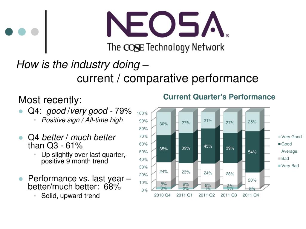 Most recently: • Q4: good /very good - 79% • Positive sign / All-time high • Q4 better / much better than Q3 - 61% • Up slightly over last quarter, positive 9 month trend • Performance vs. last year – better/much better: 68% • Solid, upward trend How is the industry doing – current / comparative performance